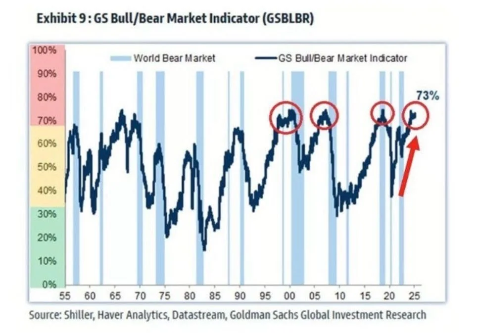Goldman Sachs Bull/Bear Market Indicator, which assesses market and economic sentiment, has reached 73%, one of its highest readings historically. This aligns with previous peaks observed before bear markets in 1999, 2007, and 2020, suggesting heightened investor euphoria.