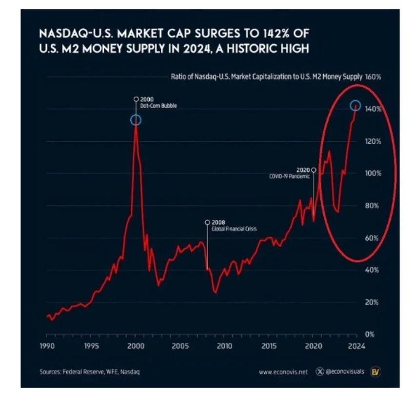 The ratio of Nasdaq's market capitalization to the U.S. M2 Money Supply has reached a record 142%, doubling over the past five years and surpassing levels seen during the dot-com bubble (~130%). This indicates that the growth in equity markets has significantly outpaced the increase in money supply.