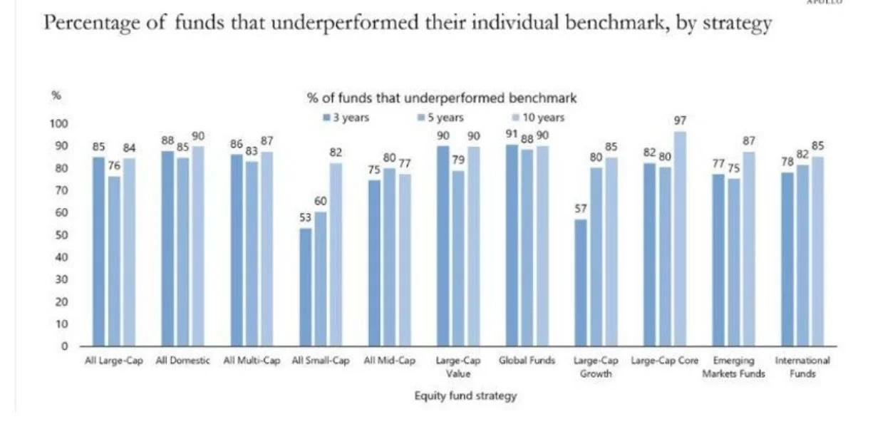 According to S&P Global, 80% to 90% of active fund managers have underperformed their benchmarks over the past decade. The chart below highlights the persistent struggles of active management across all strategies.