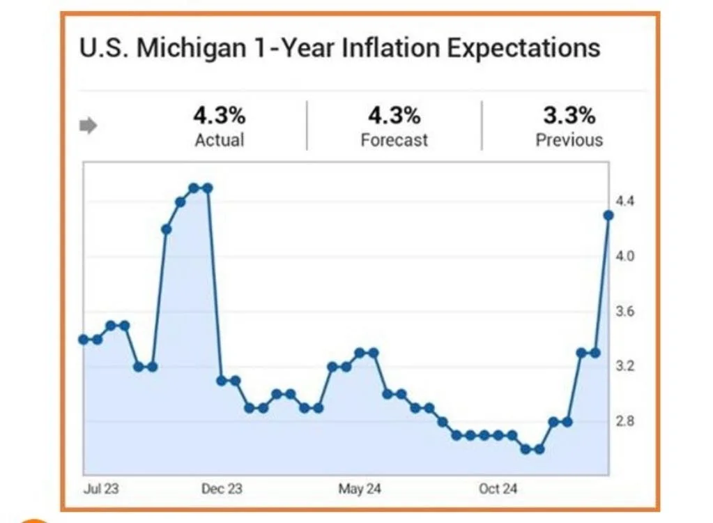 In February, the University of Michigan reported that consumers expect inflation to rise to 4.3% over the next year, a significant increase from 3.3% in January. This marks the highest level since November 2023. The surge is attributed to anticipated price hikes due to tariffs and a tight labor market, potentially exacerbated by recent immigration policies.