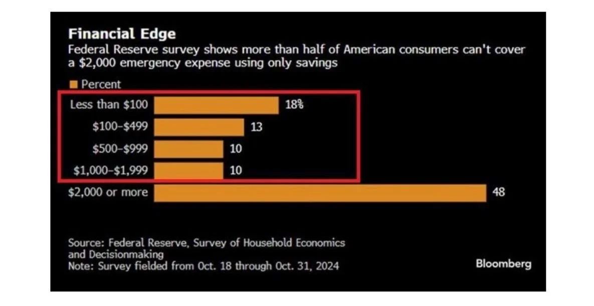 A new Federal Reserve survey shows that over 50% of U.S. consumers cannot cover a $2,000 emergency from savings alone, and nearly one-third can’t even manage $500.