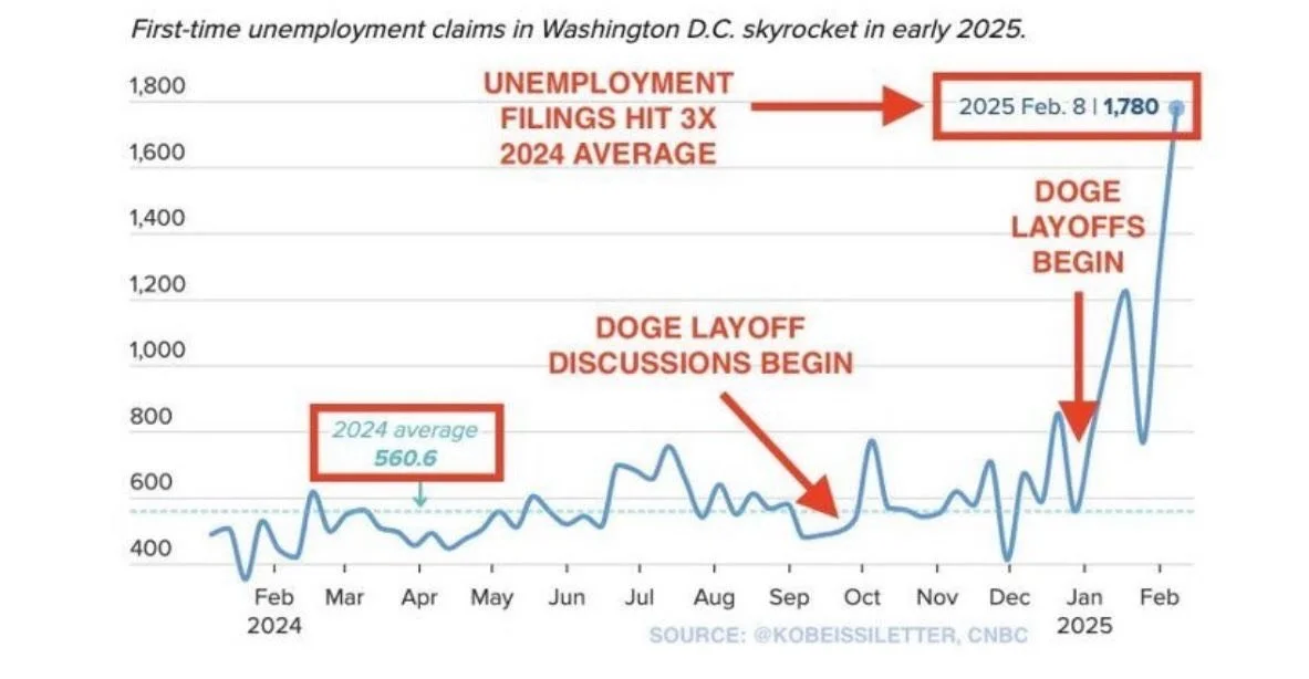 Unemployment claims in Washington D.C. have surged by 36% in a single week, tripling the average rate. Over the past six weeks, claims have increased by 55%, surpassing levels seen in 2008. Since January 20th, over 4,000 federal employees have filed initial unemployment claims, with the year-to-date total nearing 7,000 a 55% increase over the previous six-week period.