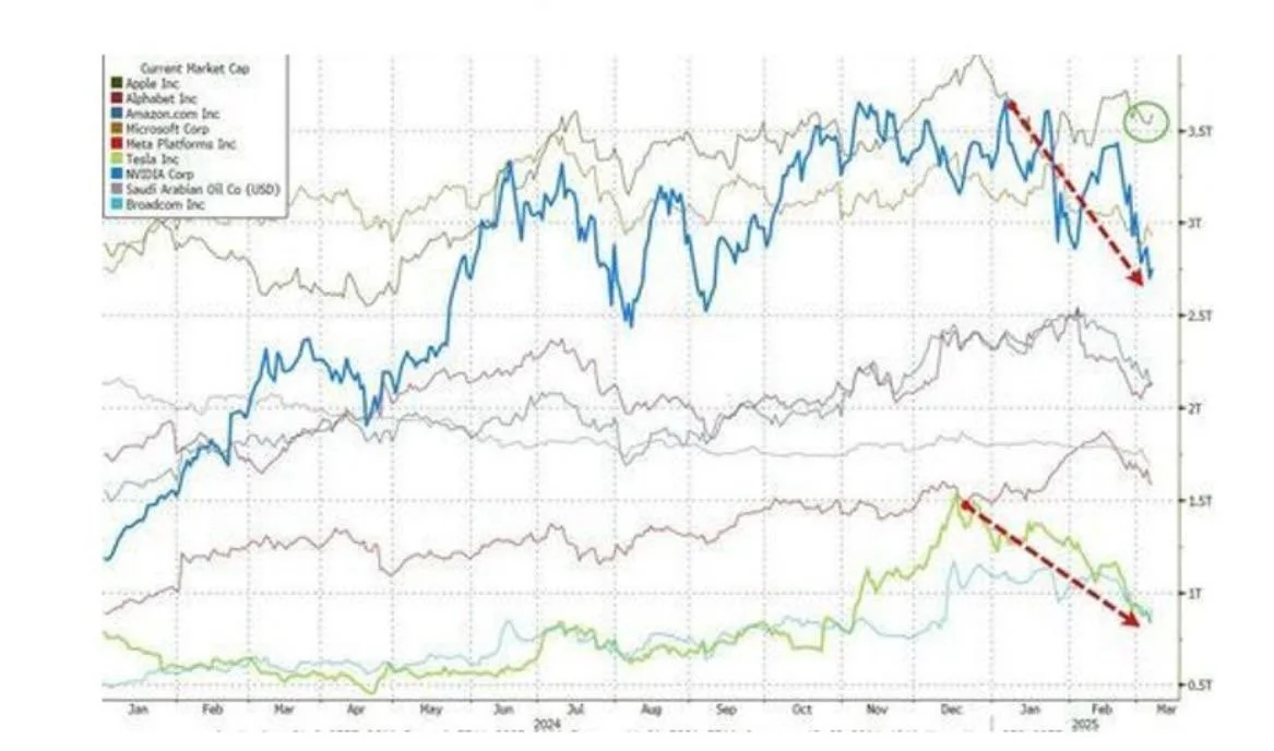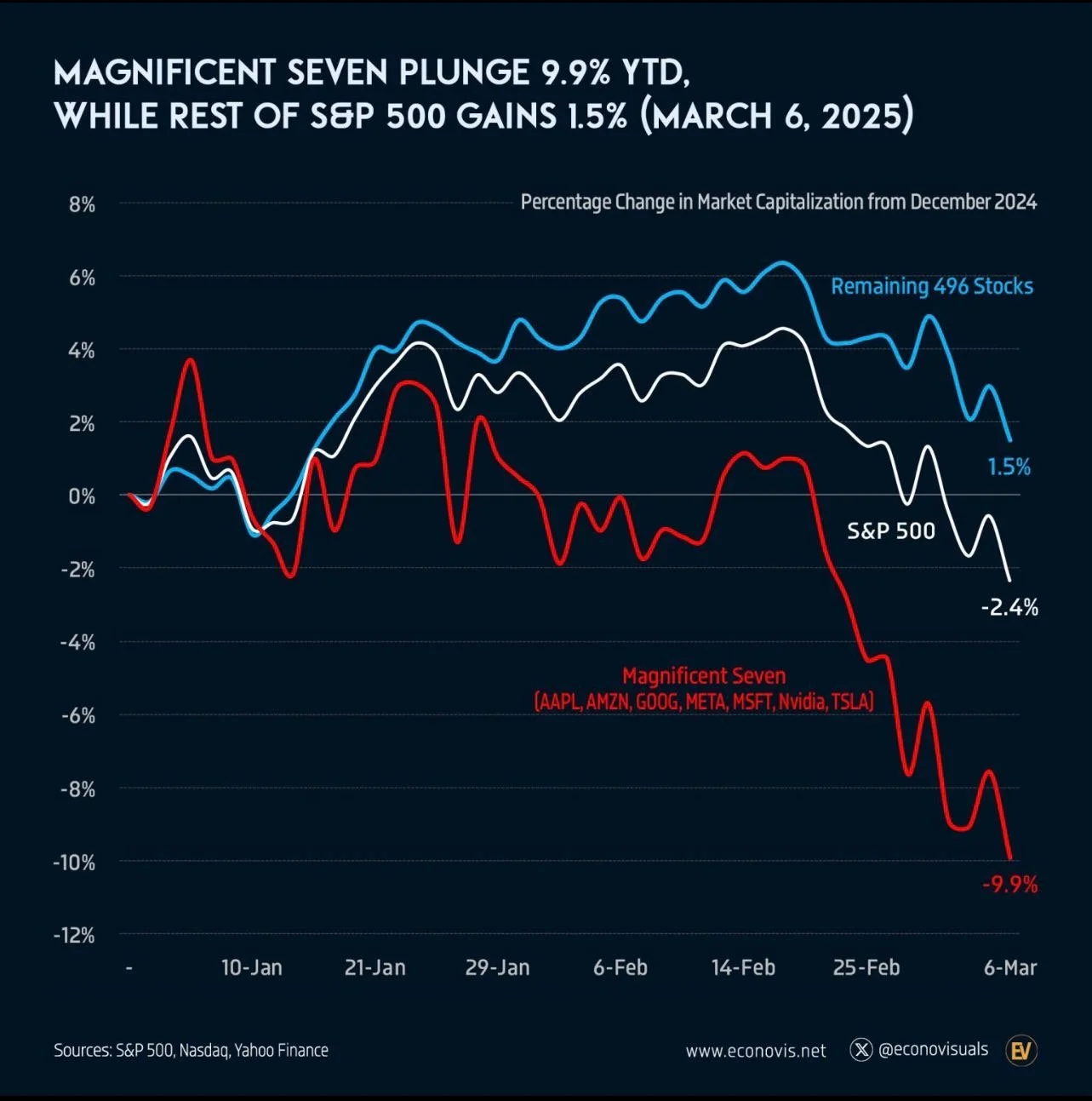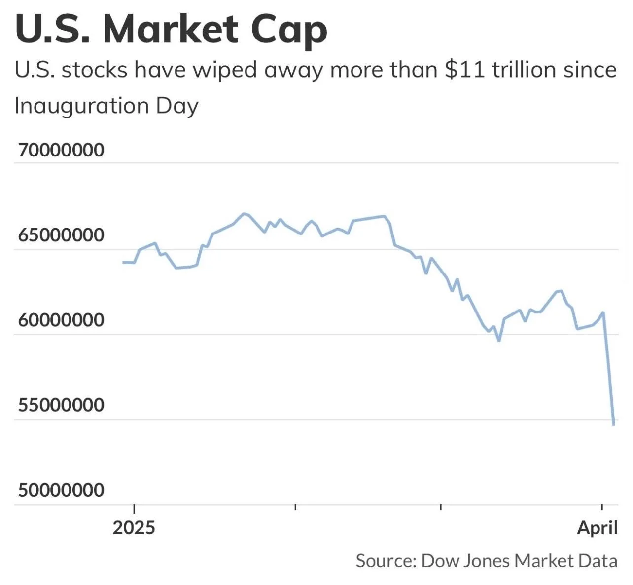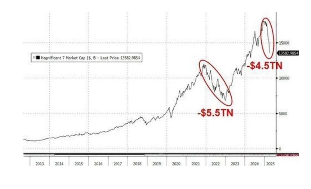 Following an aggressive tariff announcement on Wednesday—and subsequent retaliatory tariffs from China on Thursday—a sharp selloff in equities ensued. Over the span of two days, more than $5.4 trillion was erased from the U.S. stock market, bringing total losses since Inauguration Day to $11 trillion. Notably, the Mag 7 lost $1.8 trillion in market cap during this period.
