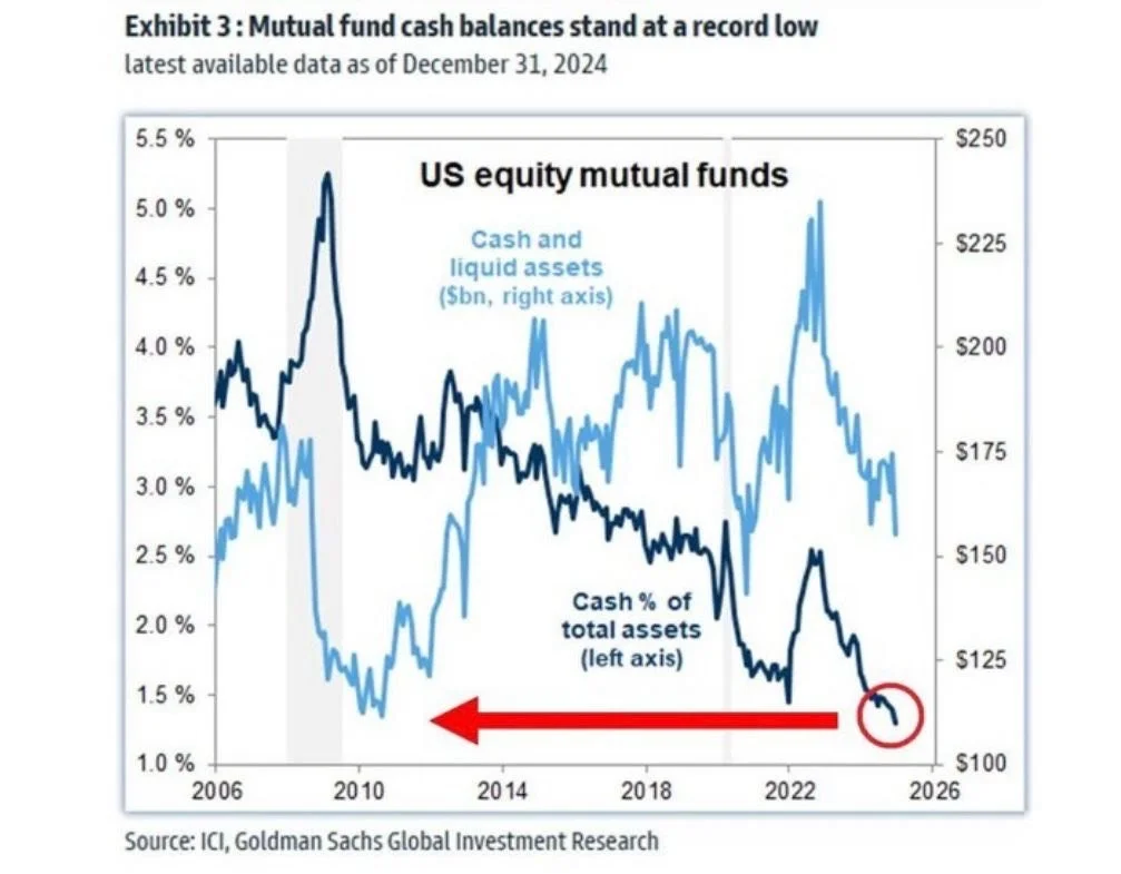 Cash holdings in U.S. equity mutual funds have declined to a record low of 1.3%, even lower than levels observed in early 2022 when the bear market commenced. This indicates limited liquidity available for further stock investments.