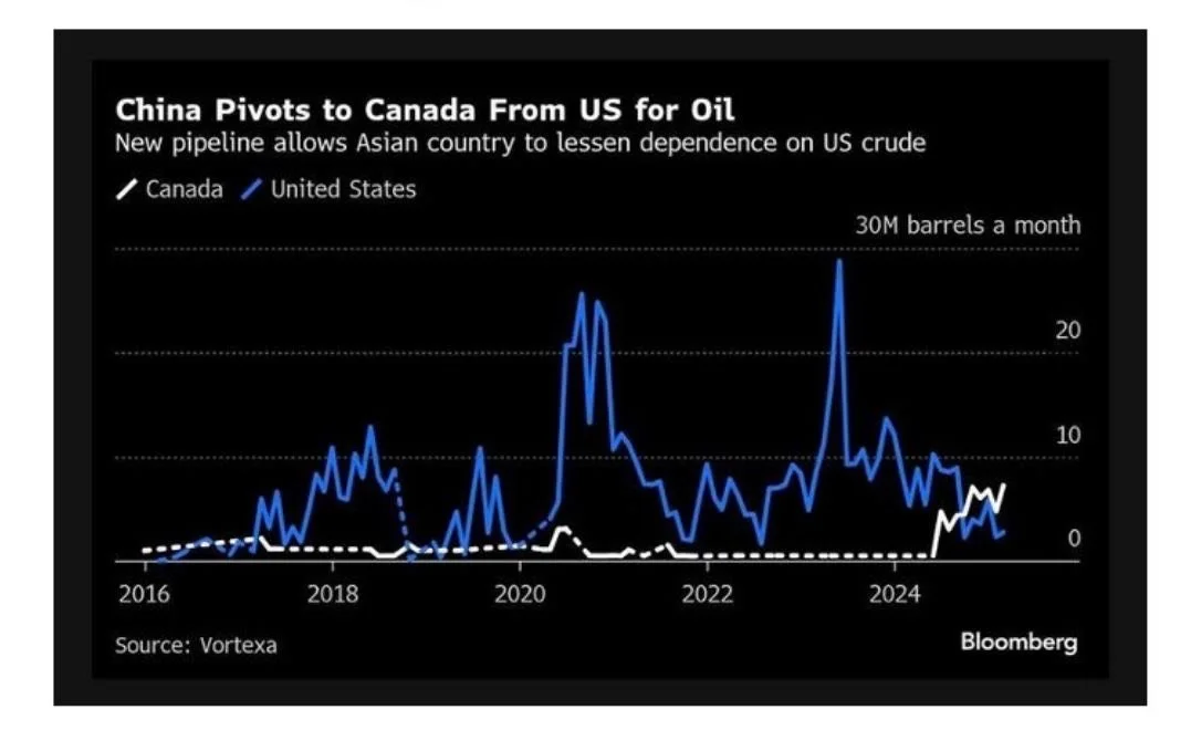 China’s purchases of American oil are down 95% Y-Y, China’s purchaser of Canadian oil are up 700% Y-Y. That’s a $20bn annual loss for the U.S. at $60 oil.