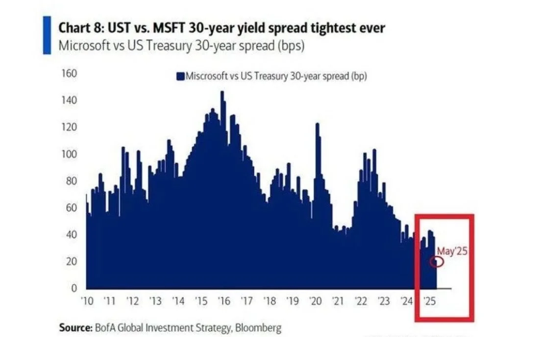 The yield spread on Microsoft’s 30-year bonds over equivalent U.S. Treasuries has dropped to just 20 basis points, the lowest on record—implying Microsoft’s credit is nearly as safe as the U.S. government’s.