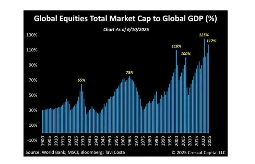 Global equities are in their second most overvalued year in history based on the market cap-to-GDP ratio. The only time valuations were higher was in 2021. The so-called “Buffett Indicator” has surged to 200%, just shy of its all-time peak.