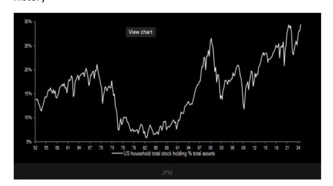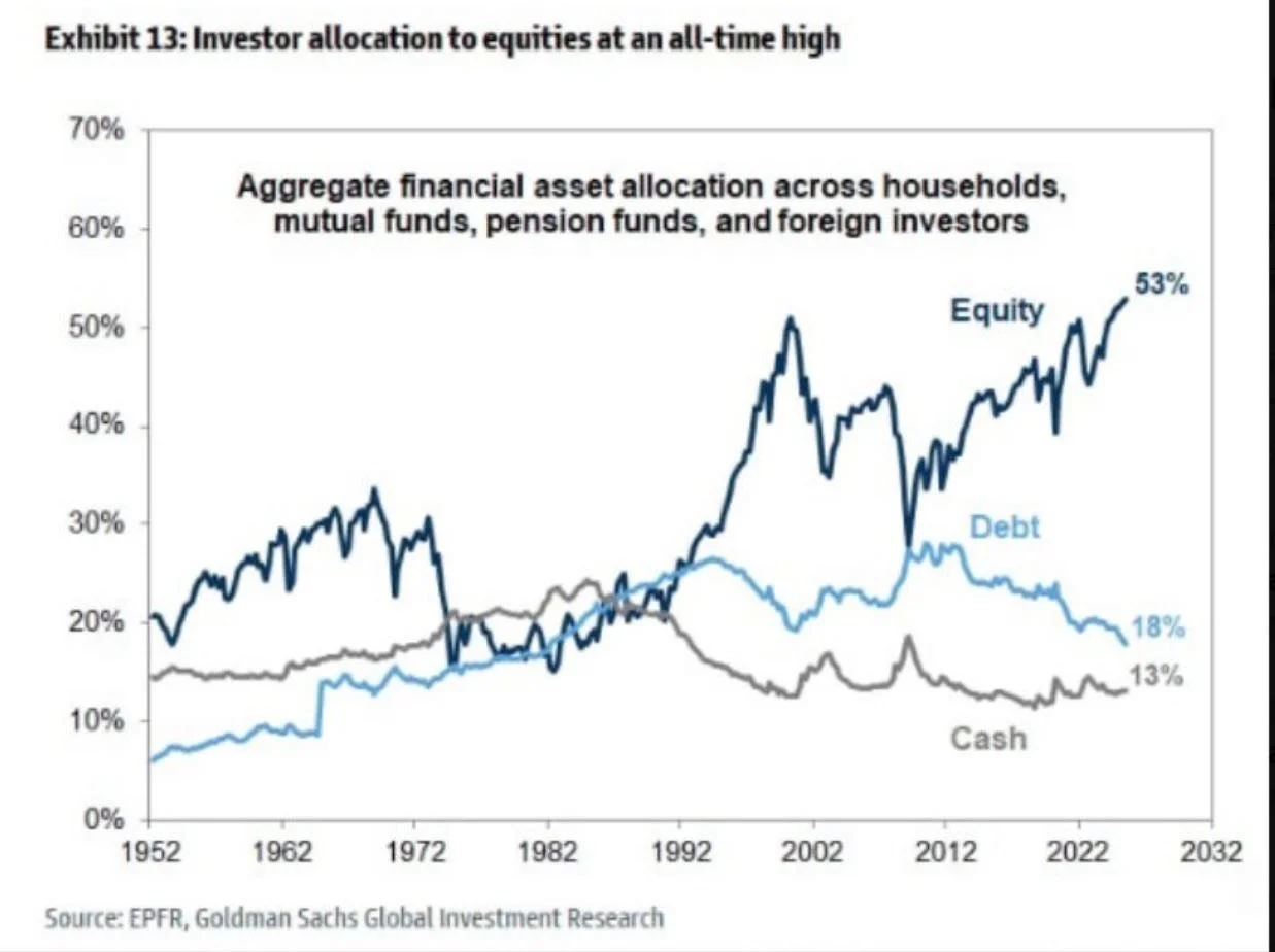 Investor allocations to stocks are now at the highest level ever recorded—surpassing even the peak just before the dot-com bubble burst.