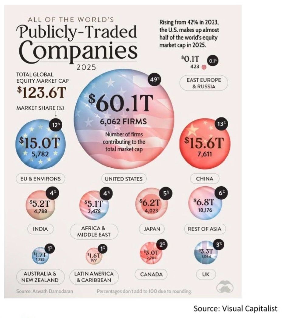 The United States accounts for nearly half of the world's stock market capitalization, underscoring its significant influence in global equity markets.
