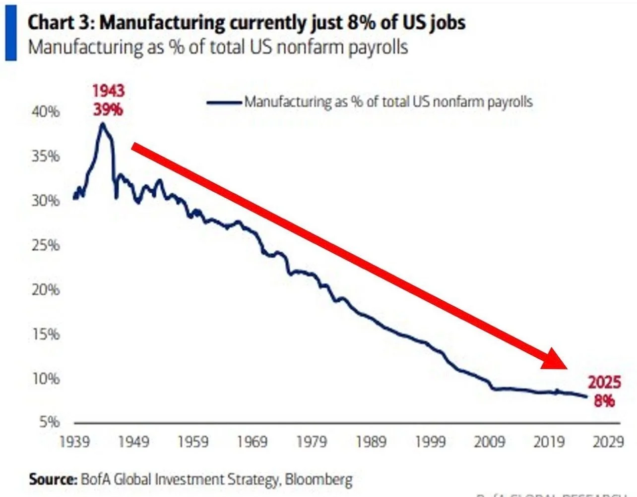 The decline in U.S. manufacturing employment has been striking. This long-term structural trend has been driven by a combination of factors, including globalization and trade policy shifts, rapid technological progress, increased automation, and a broader transition toward a service-based economy.