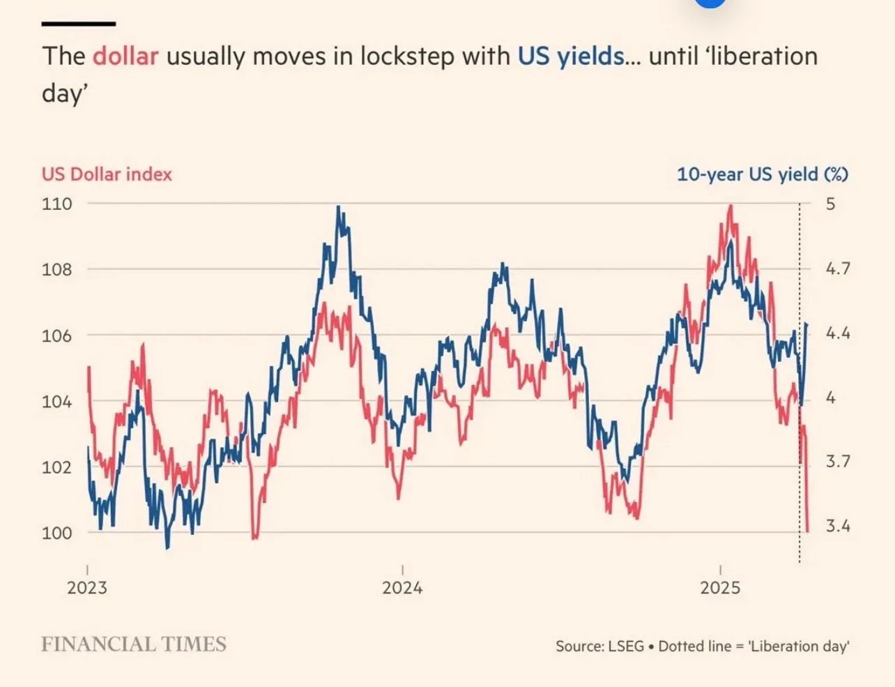 Generally these two move in sync since Treasuries are seen as risk-free. When the yield goes up, investors want to lock into the higher rates. This increases the demand for the dollar, which means the USD index and the yield move in sync.