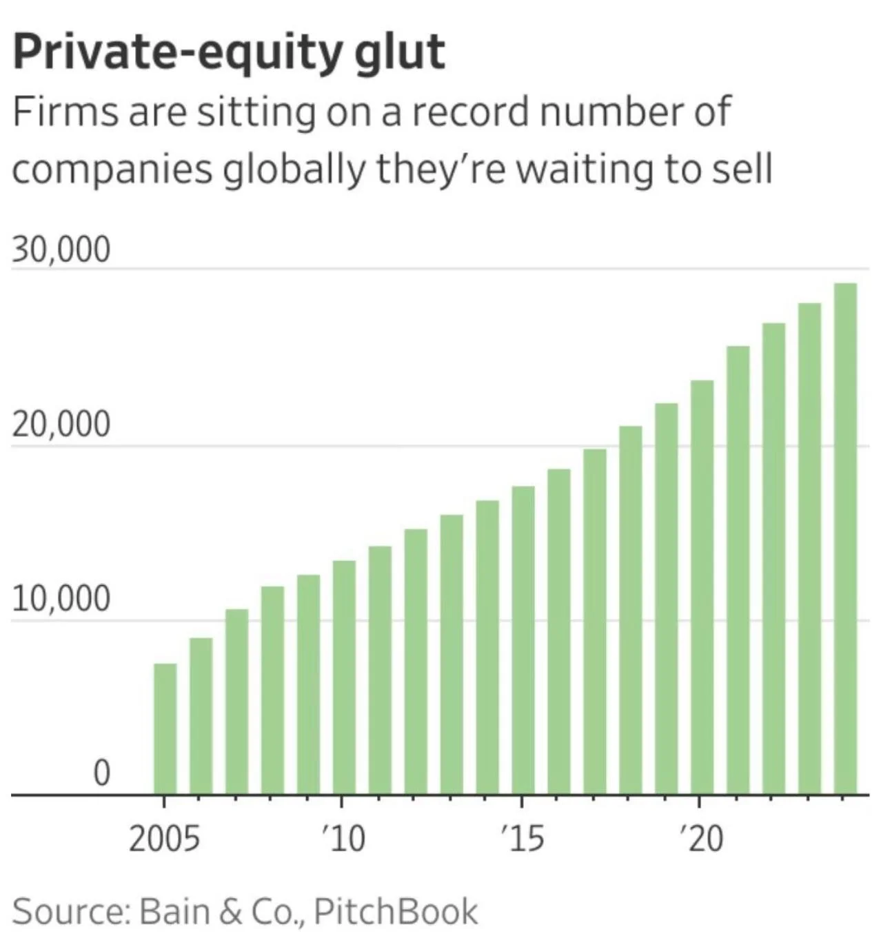 Private equity is holding off on exits. According to Moody’s, the ratio of available capital—or “dry powder”—to the value of unsold portfolio companies has dropped to a record low.