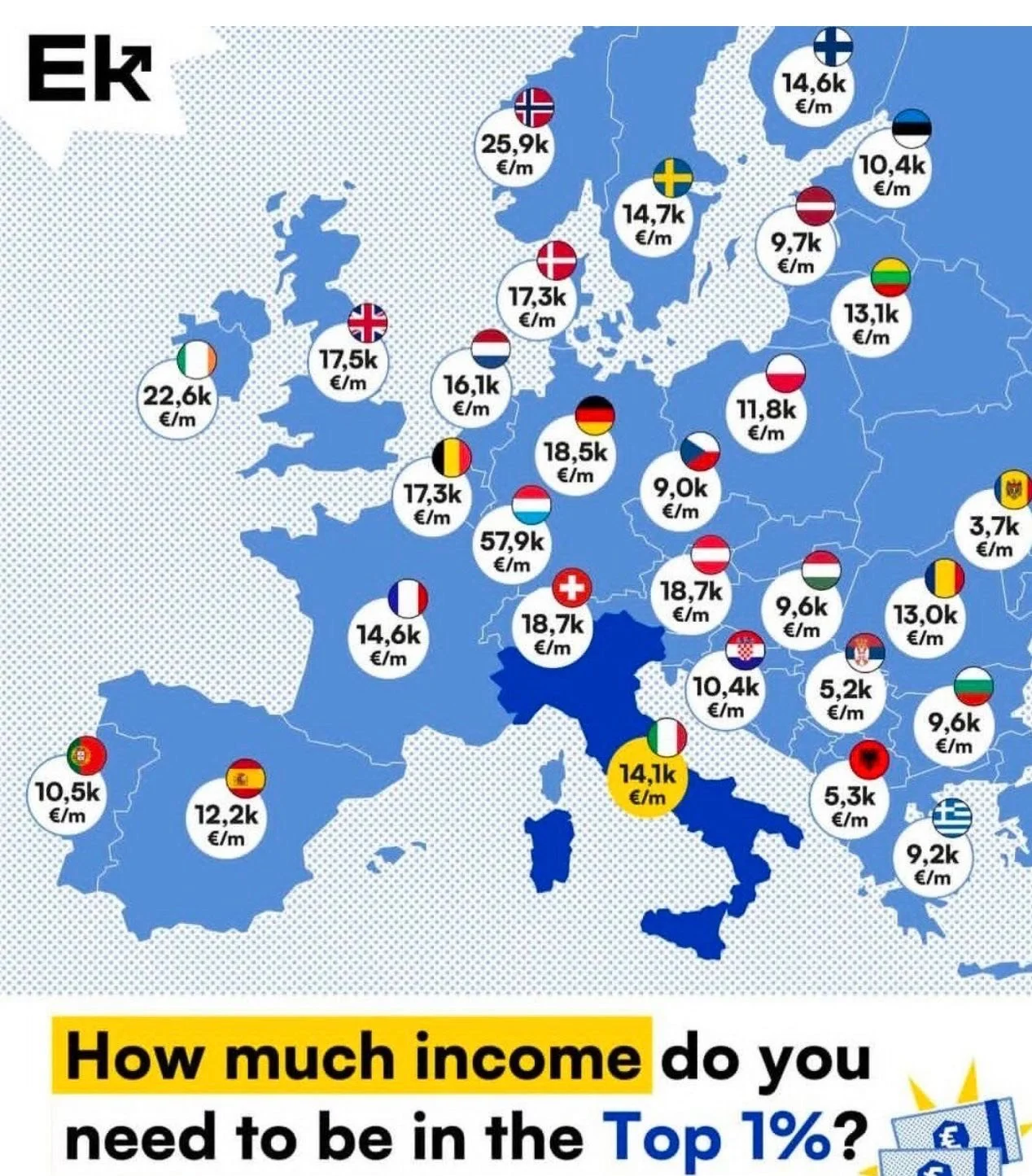 For context, reaching the top 1% of earners in the U.S. requires an income of approximately $66,000 per month (€58,000).