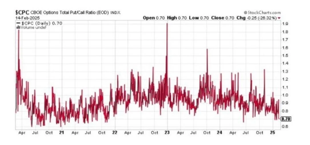 The 30-day moving average of the put-to-call ratio has fallen to its lowest point since November 2021, a month before the 2022 bear market began. This mirrors levels seen in February 2020, prior to the market crash, indicating a potential lack of hedging and possible market complacency.
