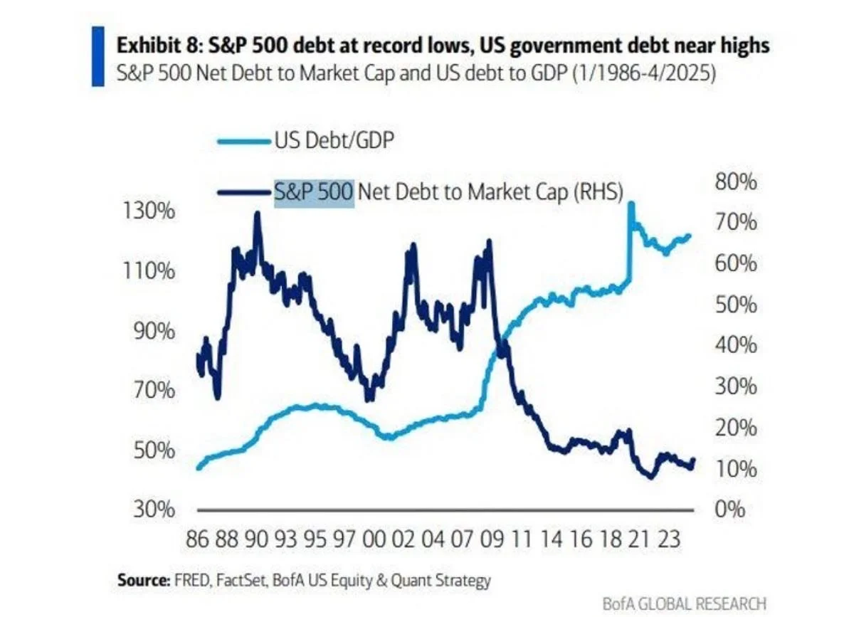 While S&P 500 corporate debt levels are at record lows, U.S. government debt continues to climb to record highs.