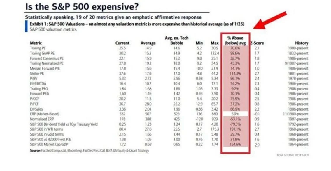 According to a Bank of America analysis, the S&P 500 appears overvalued on 19 out of 20 metrics. Notably, the Buffett Indicator (Market Cap to GDP ratio) exceeds historical averages by over 100%
