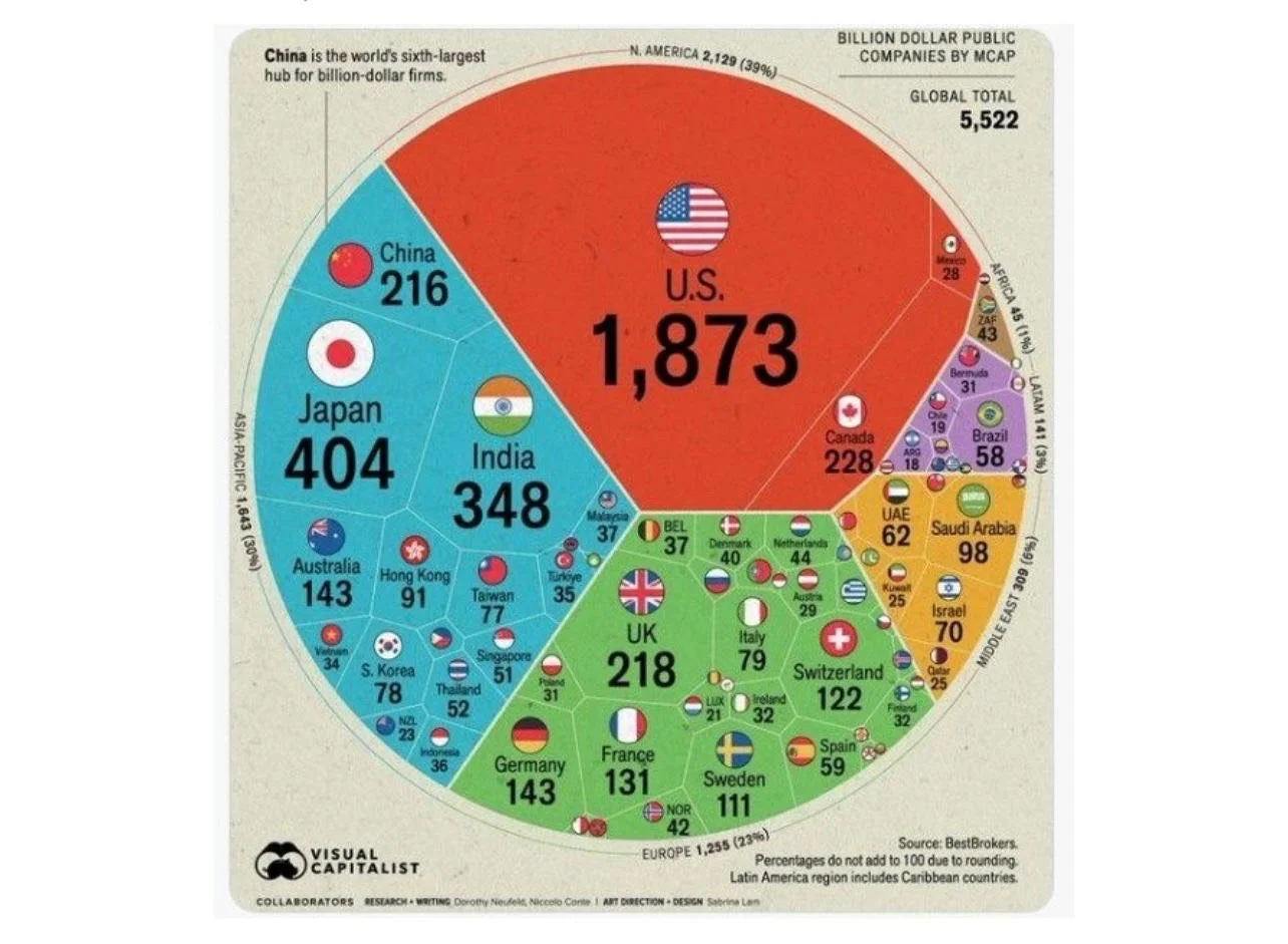 There are 1,873 billion-dollar companies based in the U.S., far ahead of Japan (404) and India (348)—a testament to American corporate scale and innovation.