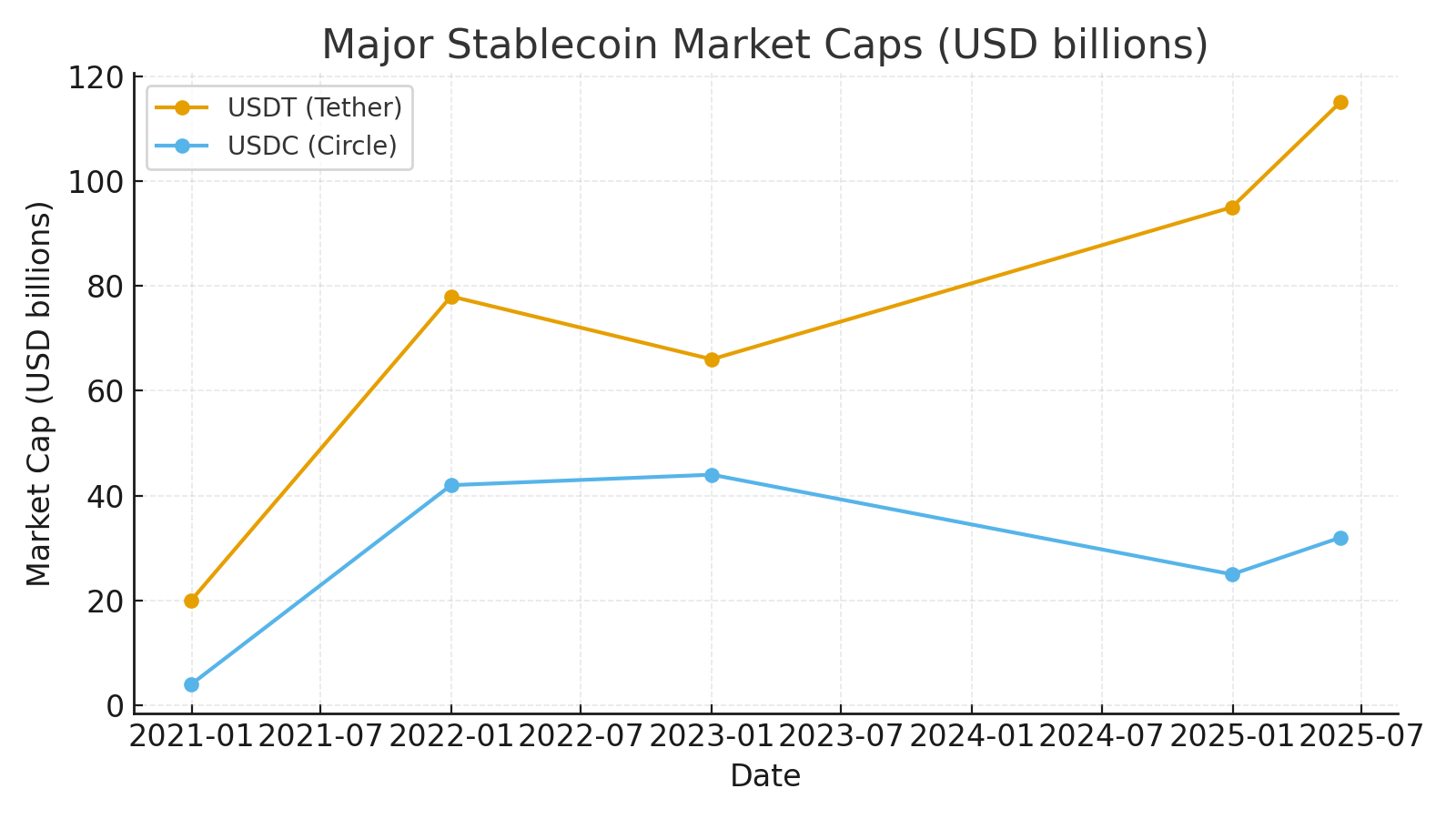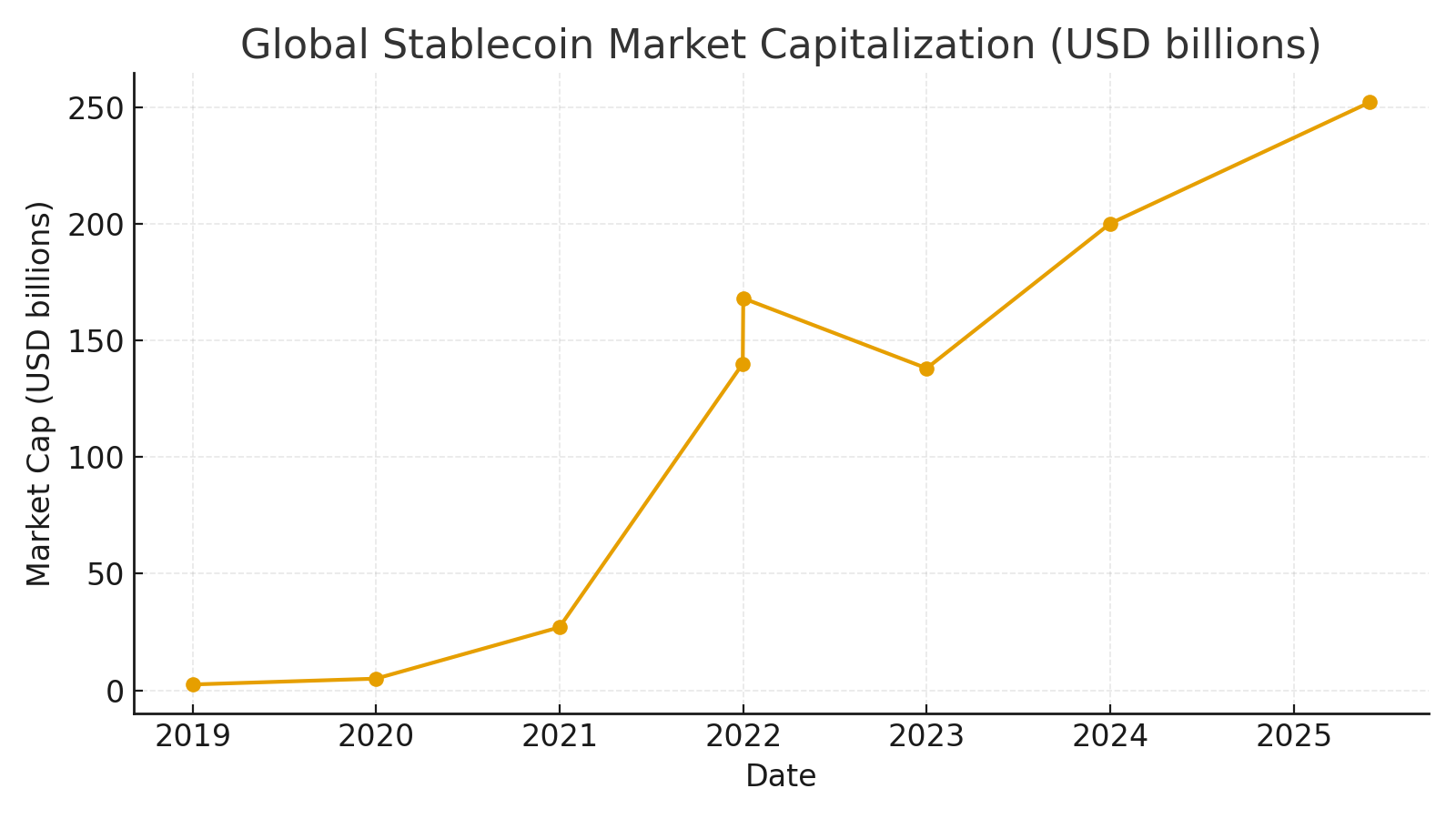 Global stablecoin capitalization has rebounded to ~USD 250B+ as of mid‑2025 from ~USD 27B at end‑2020, even after a 2022 deleveraging dip. That trajectory points to payments and treasury‑like use cases, not just speculation.