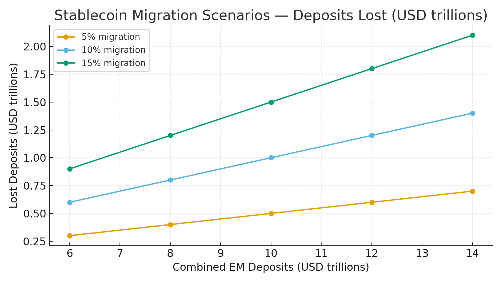 If the combined deposit base across a representative EM set is $6–14T, then 5–15% migration to stablecoins implies $0.3–2.1T of deposits lost to local banks. The practical consequence is higher loan spreads and rationing for SMEs most reliant on bank intermediation.